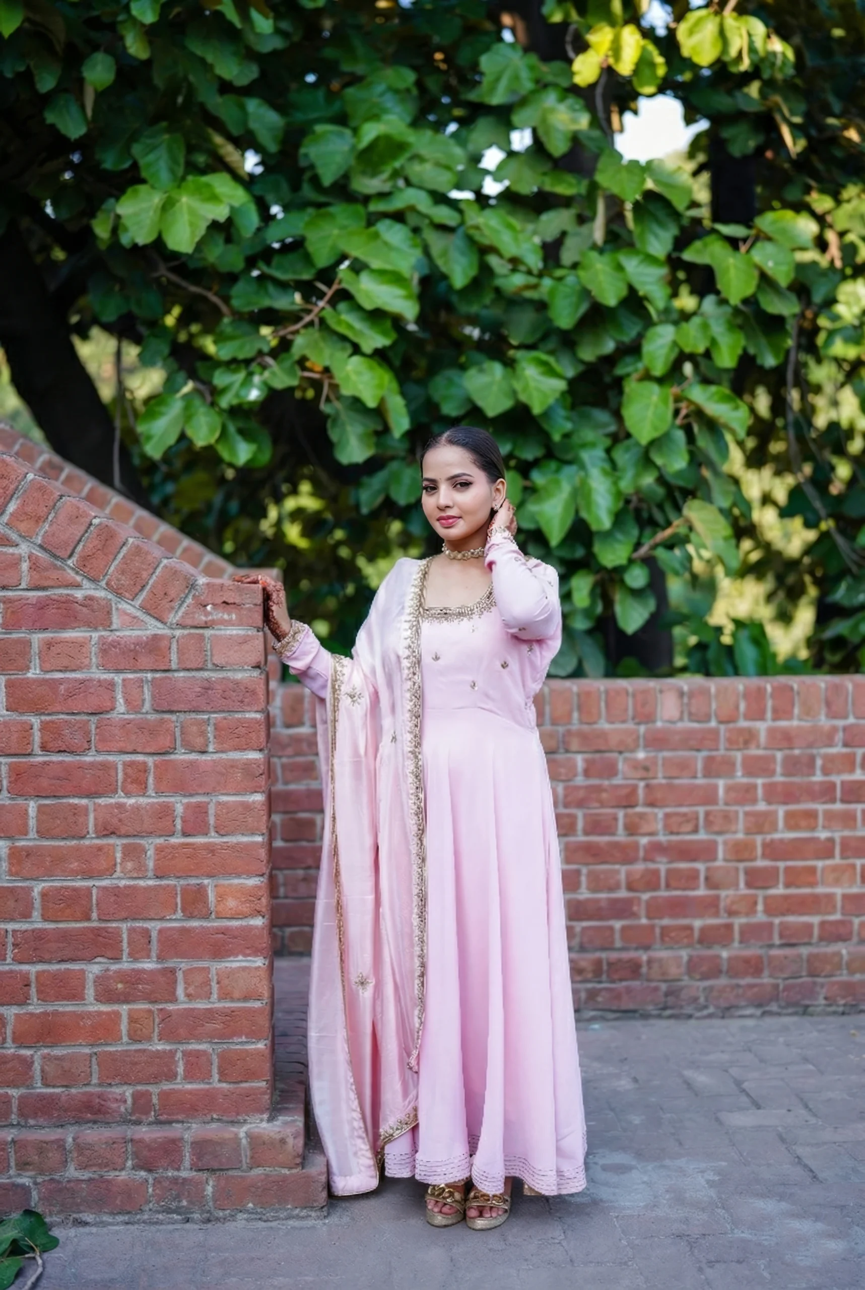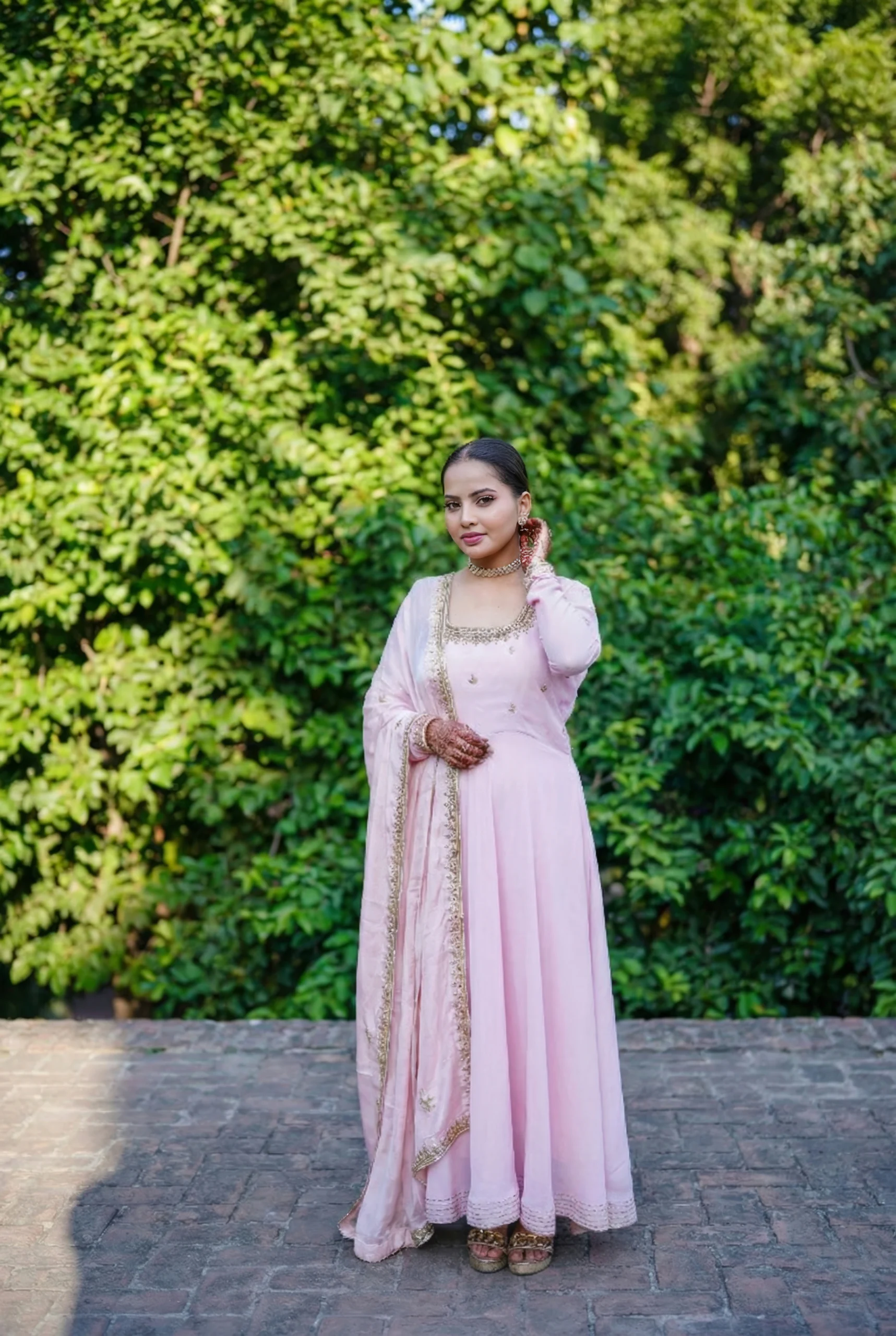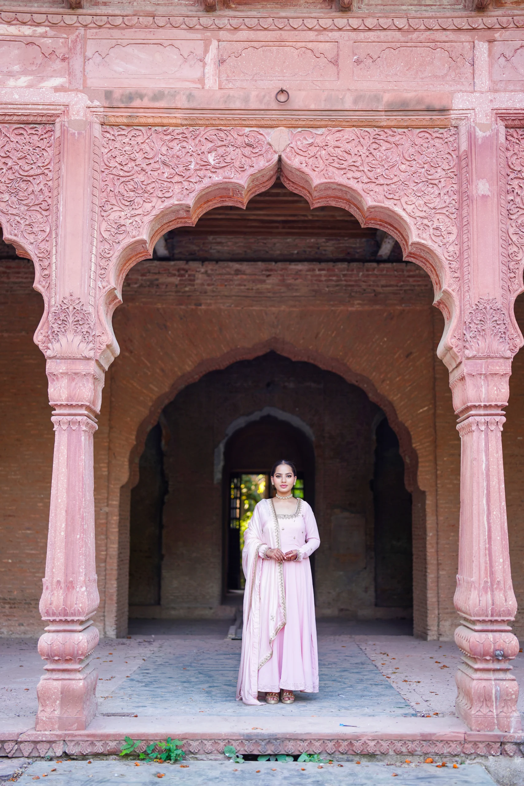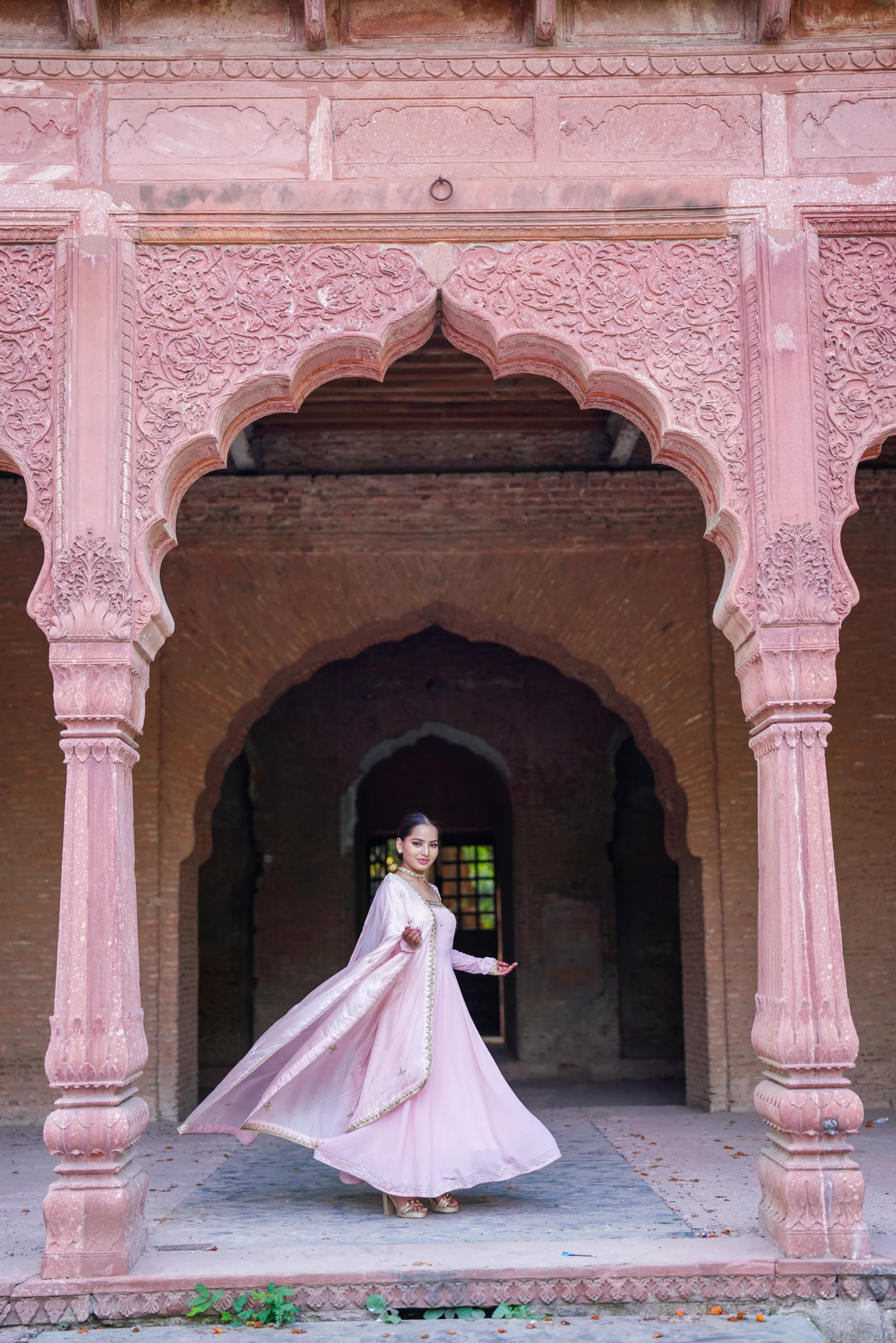 Inspired by the softer expressions of Mughal elegance, this pastel pink Anarkali dress is crafted from premium Georgette, a lightweight, fluid fabric celebrated for its graceful drape and lasting comfort. Introduced in early 20th-century France and embraced by Indian couture for its delicate movement, Georgette lends an airy refinement to this timeless silhouette.