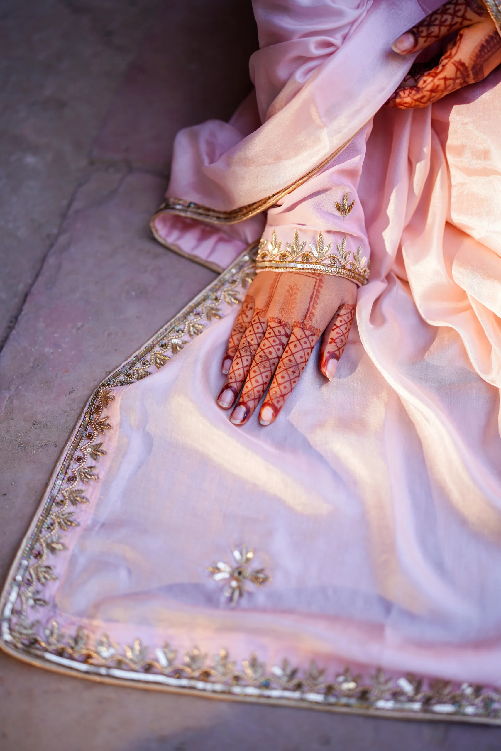 Adorned with intricate cutdana embroidery that catches light with a gentle glow, and traditional dabka work that adds depth and quiet regality, every detail is meticulously handcrafted. The embroidery carries forward the legacy of generations of artisans, blending heritage with understated modern grace.